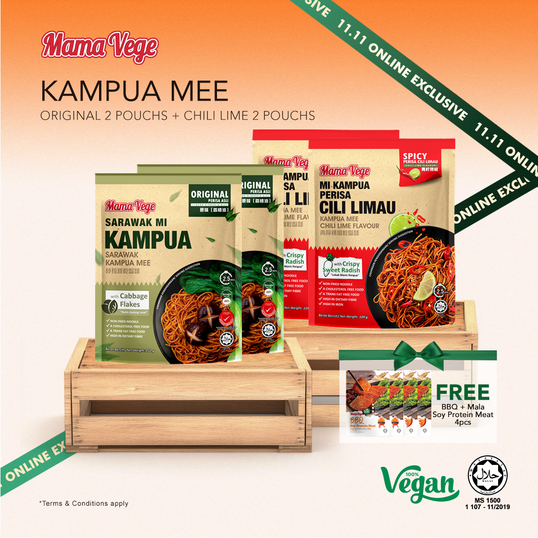 Promo Code: MAMAVEGE11 to enjoy promo price RM22.80 (original RM29.60) Promo Combo Set consists of:2 pack of Individual Pack Kampua Mee Toona Sinensis 2 pack of Individual Pack Kampua Mee Chili Lime [FREE] 4 pcs Soy Protein Meat (2 pcs BBQ + 2 pcs MALA)   Individual Pack Kampua Mee Chili Lime ...Read more