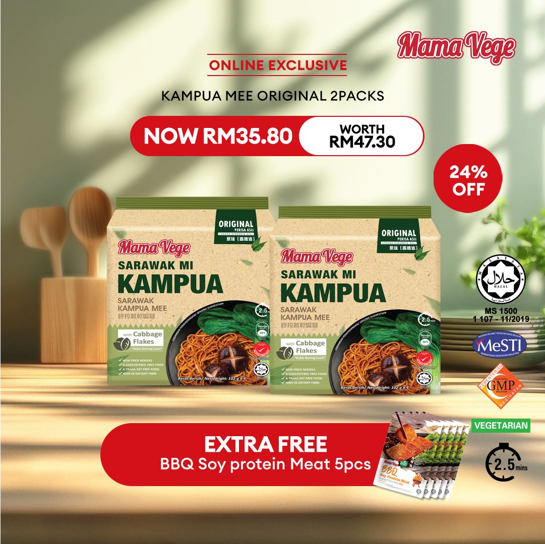 Promo Code: MAMAVEGE1 to enjoy promo price RM35.80 (original RM47.30)   Promo Combo Set consists of:1 x Kampua Mee Toona Sinensis1 x Kampua Mee Chili Lime [FREE] 5 pcs Soy Protein Meat (BBQ)   MamaVege Sarawak Kampua Mee comes with NEW PACKAGING & NEW FLAVOUR!Get the healthier noodles. A n ...Read more