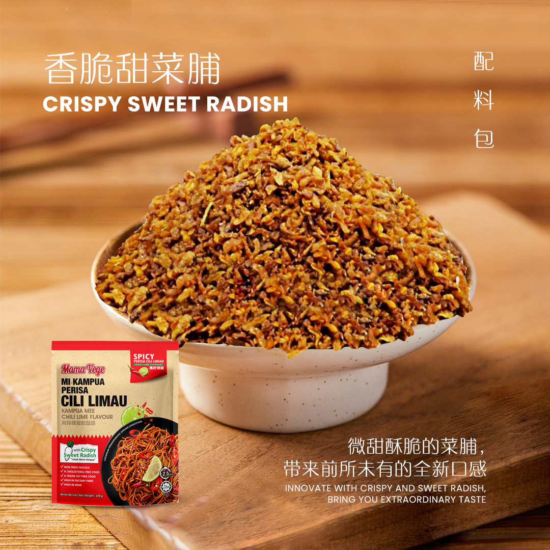 [HIASAN] Minyak Sayuran, Lobak Manis(Produk menggunakan 301g lobak manis untuk menvediakan 100g lobak manis rangup) , Gula, Perisa Vegetarian.