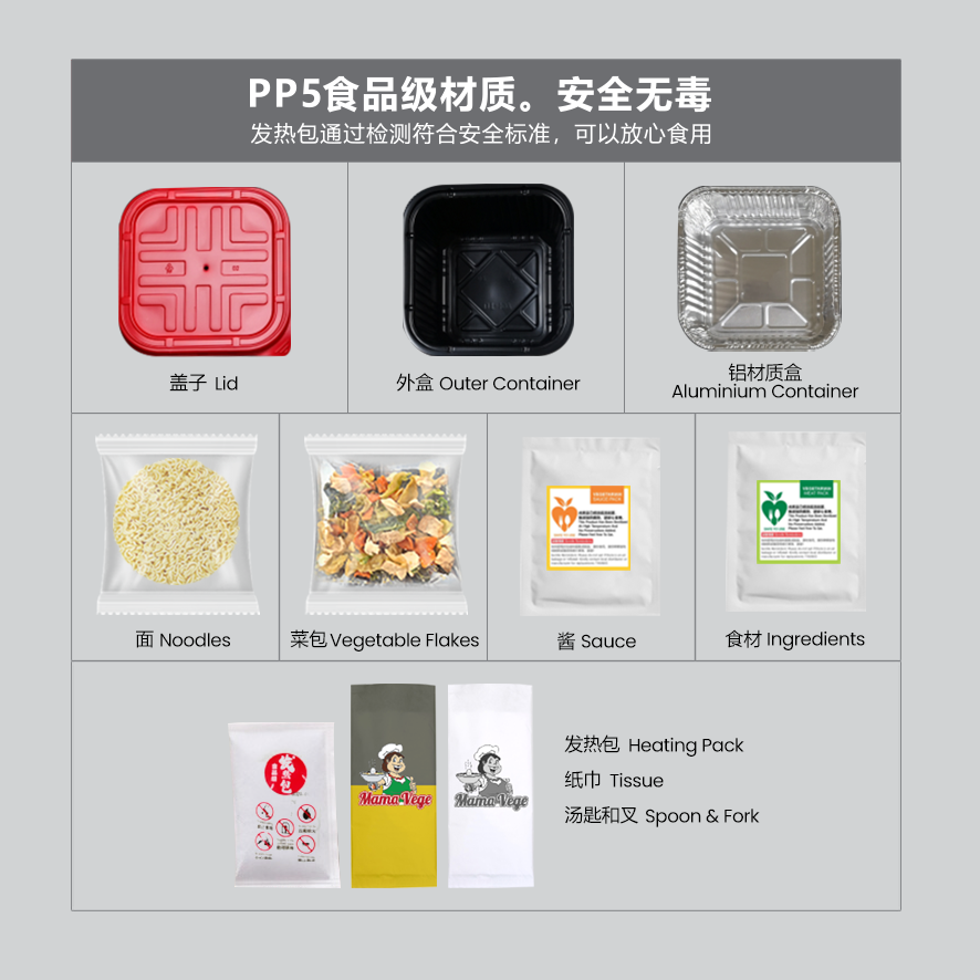 产品包装: 面,发热包,食材,东炎酱料,汤匙和叉