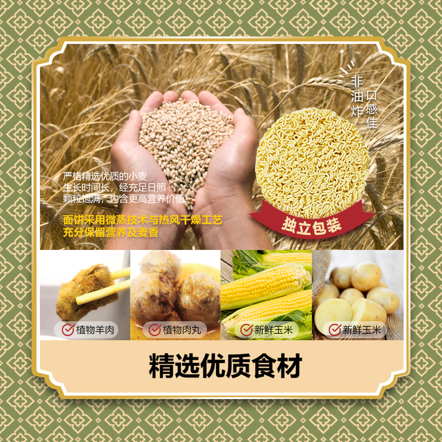 面饼采用微蒸技术与热风干燥工艺,充分保留营养及麦香。非油炸,口感劲道!