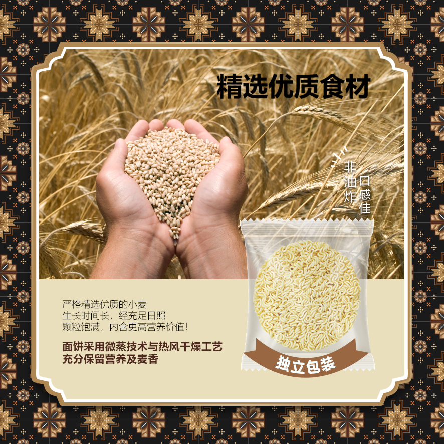 面饼采用微蒸技术与热风干燥工艺,充分保留营养及麦香。非油炸,口感劲道!