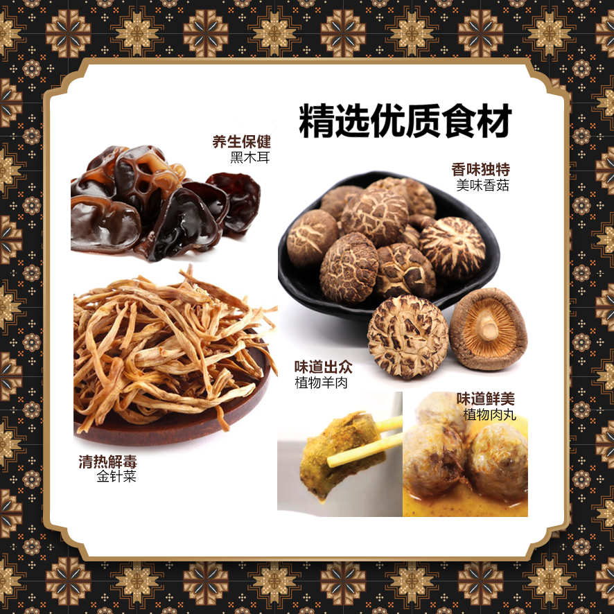 产品食材: 木耳, 金针菜,素羊肉,素肉丸,香菇,菜包