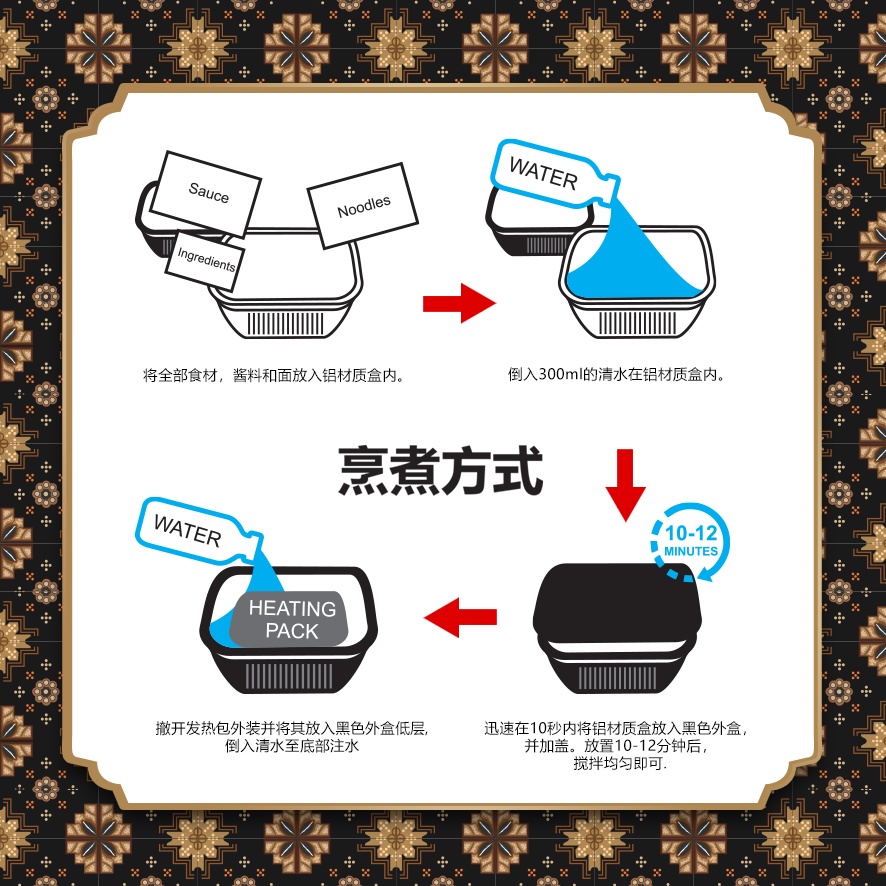 产品包含: 面,发热包,食材,肉骨茶酱,菜包,汤匙和叉,纸巾